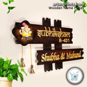 hospitality, honor, and a home that welcomes guests with positivity and grace. The layered wooden structure gives the design a distinctive handcrafted appearance, adding depth and character to the overall look. Expertly designed and handcrafted by artsnprints.com, this nameplate blends spirituality with artistic craftsmanship, making it ideal for apartments, villas, and traditional homes.